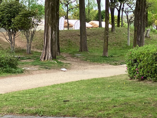 へーわの象徴がなにかついばんでいる。万博開催セレモニーからのはぐれ鳩?
